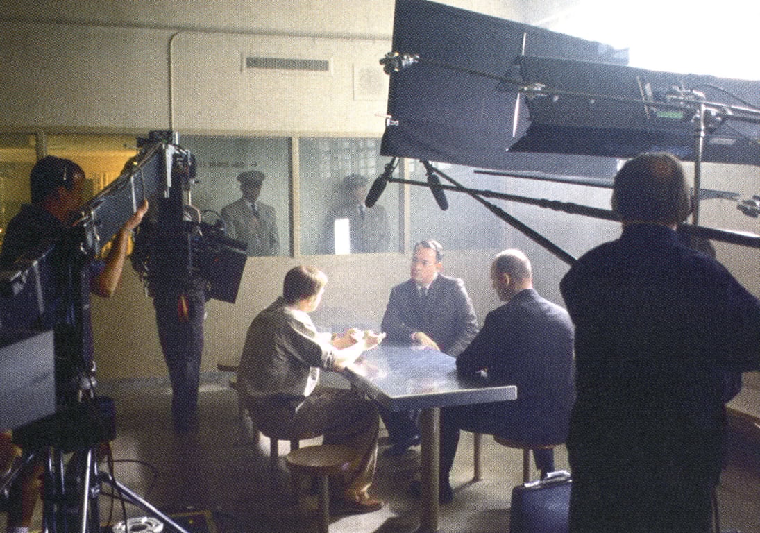 Devlin: It was fun to walk into that huge bank and see five huge windows and say, ‘We’re going to need five Musco lights.’ The producers thought I was kidding at first, but it didn’t make sense to move lights like that around because we could easily see all the windows in one shot. On the day of the shoot, if we’re not ready to fulfill this story point for Steven, then why are we there? He really wanted to see the whole place. We had some Seven-Minute Drills in there, but you can often lose the magic if you start filling it in too much. The Muscos lit the set, and the wide shots will look great because there’s a bit of atmosphere and you can see our ‘sun’ coming through it. But what really makes that scene is much subtler: there’s a shot of Abagnale coming up to the teller window to submit a forged check, and there’s a backlight on the bars of the teller window that Janusz rushed to add after the third take. It was probably a Tweenie gelled with full blue because we didn’t have an HMI handy; it perfectly highlighted the bars and the forged check.