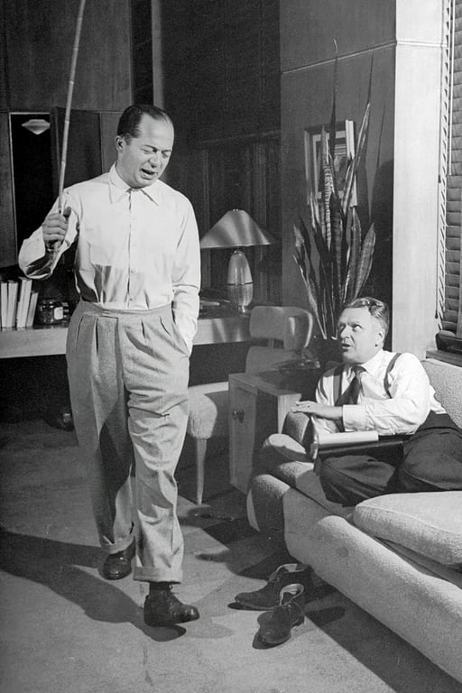 “The distinguished Viennese-looking gentleman is Charles Brackett of Saratoga Springs, New York. The tough New Yorkerish cherub is Billy Wilder from Vienna, Austria. Brackett, a man of sartorial elegance, prefers double-breasted suits in conservative designs and colors. Wilder goes around wearing a pullover without a tie, his shirt sleeves rolled up. Brackett is reserved, serene, and gentle. Wilder is electric, impassioned, and (outwardly) tough. Brackett loathes physical exercise and buys shoes without laces because he considers tying his laces hard labor. Wilder goes in for tennis, swimming, and other outdoor sports. Brackett takes his sunshine in doses of vitamin B-12 plus cod liver oil; Wilder never gets enough of Hollywood’s brilliant sun.”