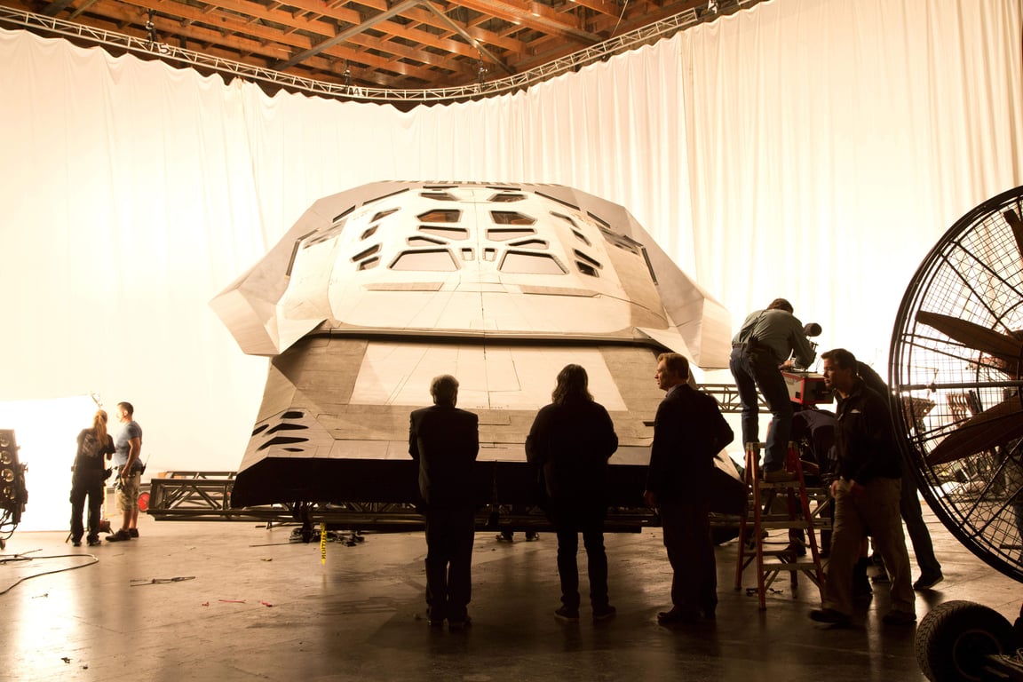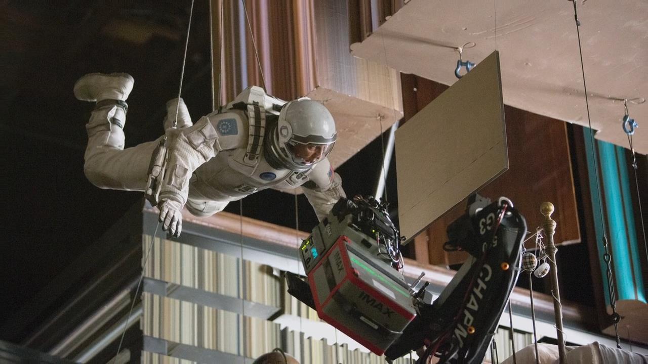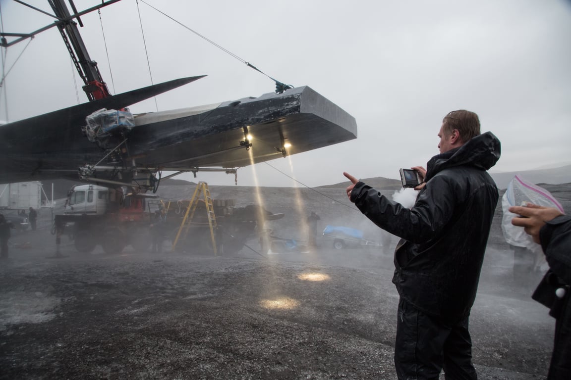 Christopher Nolan is flying a spaceship. Weighing 12 tons and mounted ten feet off the ground on a complex arrangement of pistons, this truck-sized, bevelled rectangle resembles the design sweet spot between The Dark Knight’s Tumbler, an Empire Strikes Back snowspeeder, a space shuttle and the submersible Lotus Esprit from The Spy Who Loved Me. Empire stands a safe distance from the craft’s stern, which has at its centre a circular hatch (for docking, we’re told). Its angular nose is directed away from us, towards a smoke machine, an industrial fan and a huge, white curtain which hangs from the rafters of this Sony Pictures Studios sound stage (the same one that housed the Batcave). And hard-mounted on the spaceship’s top port side, like a noisy, boxy carbuncle, is an IMAX camera.