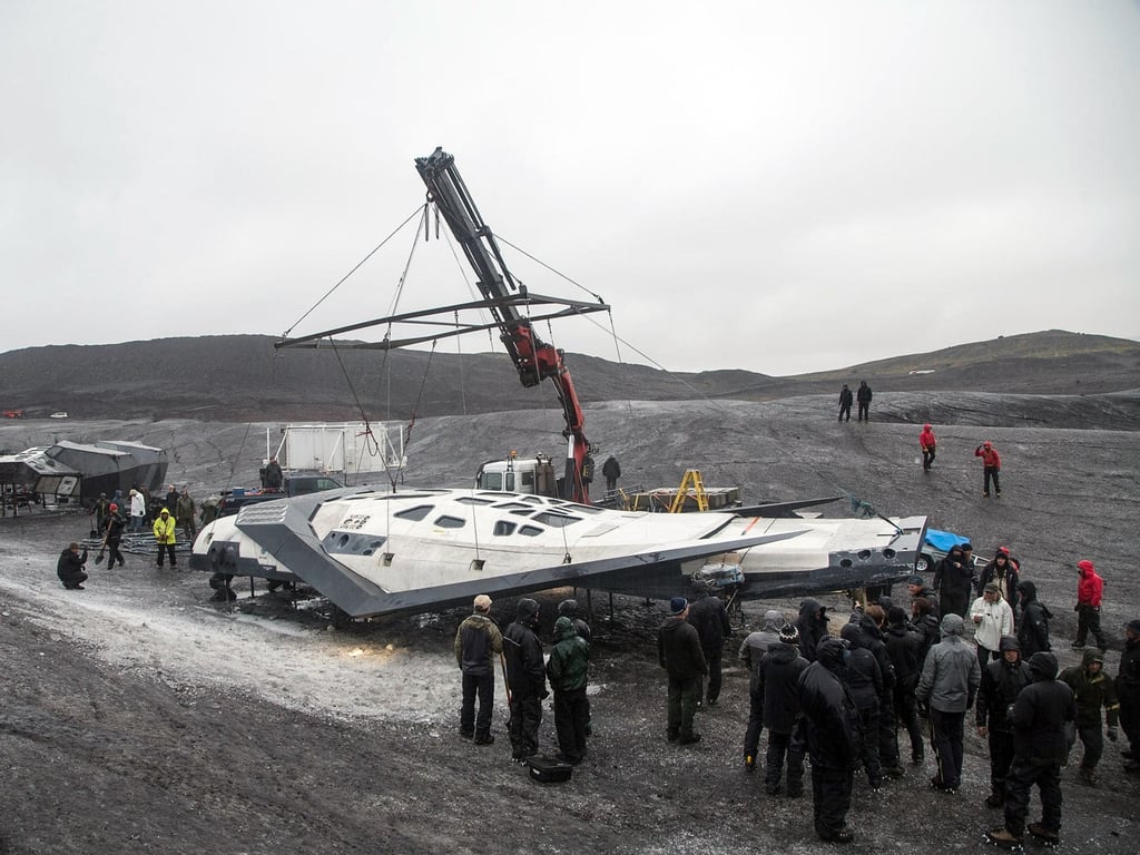 Nolan didn’t just take his cast to Iceland. He took his spaceship, the Ranger, too. “Well, that’s what we built it for,” he says. “If you’re going to bother to go to a location, you’ve got to build the stuff that you can put in that landscape.” As Nathan Crowley explains, they disassembled it, shipped it to Iceland in a 747, reconstructed it and dunked it in the cold briny for the lagoon-world scenes. “We took it out in the sea and dropped it off cranes, and we had landing gear and airlocks on it… It was a big monster.”