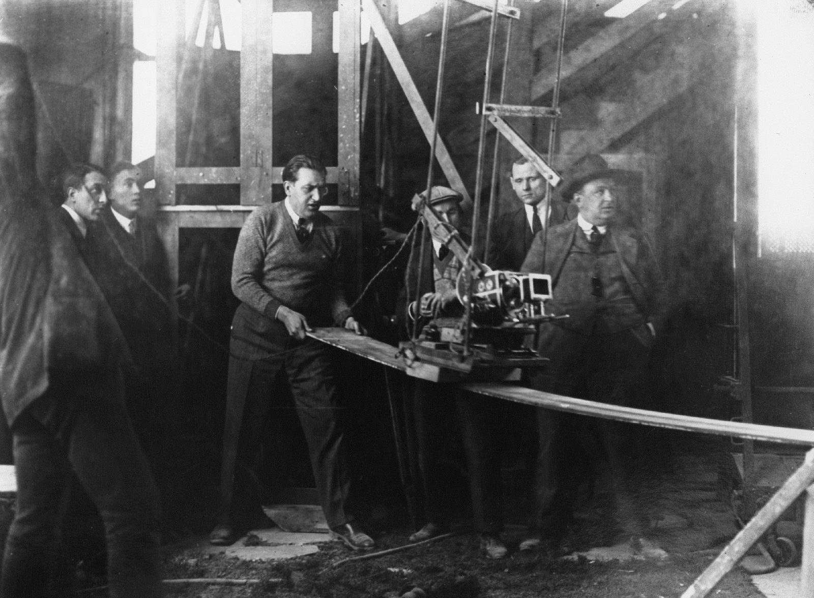 FRITZ LANG: “We constructed a miniature set of the streets about seven or eight feet long, in an old studio with glass walls and we moved the little cars by hand, inch by inch, one frame per movement, filming image by image. We moved the planes and photographed them in the same way. This scene that takes only one or two minutes on the screen took six days to shoot! Ultimately the worse difficulties we encountered were not in the shooting but in the lab. The cameraman had told the technician to develop the film normally. But the head of the lab, knowing the time we had spent filming this short scene, decided to develop it himself. No one had thought it necessary to tell him that for reasons of perspective, the cameraman had filmed the background a little out of focus to give the impression of great distance. The head of the laboratory started to develop the negative focusing the background and not the foreground. The scale of dimensions was then destroyed. I tried to keep my calm. ‘These things happen, my children,’ I said, ‘Let’s start again.’ And we did. (The first thing I discovered about making films is that you never make them alone. Your crew helps you. And I had a remarkable crew.) As for the videophone scene, it was done by projecting a part of the film shot previously in the rear of a telephone apparatus, across a translucent screen, one foot by two. This was the first rear projection and the first transparency. We didn’t realize the importance, the scope of what we had done, for if we had we would have made a fortune patenting a process universally employed today. At the time we only knew that there was a problem that had to be solved. My cameraman, Günther Rittau, was determined not to fake the shooting; he used his intelligence to arrive at this solution: he synchronized the camera with a projector that was to project the picture of a man on the videophone. That was done with linked rods connected by mobile joints going from the camera to the projector, which were, because of the shooting stage, rather far from each other. Then, when the scene started, the two machines worked at the same time in perfect synchronization.”