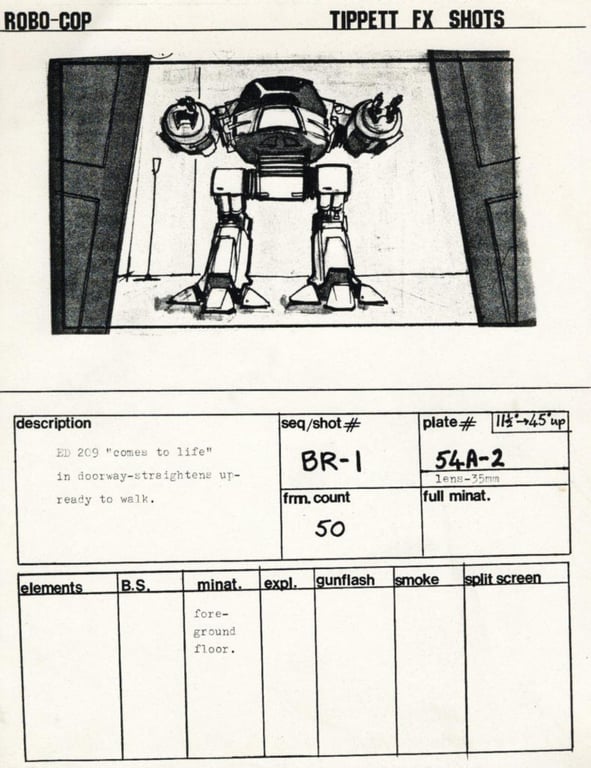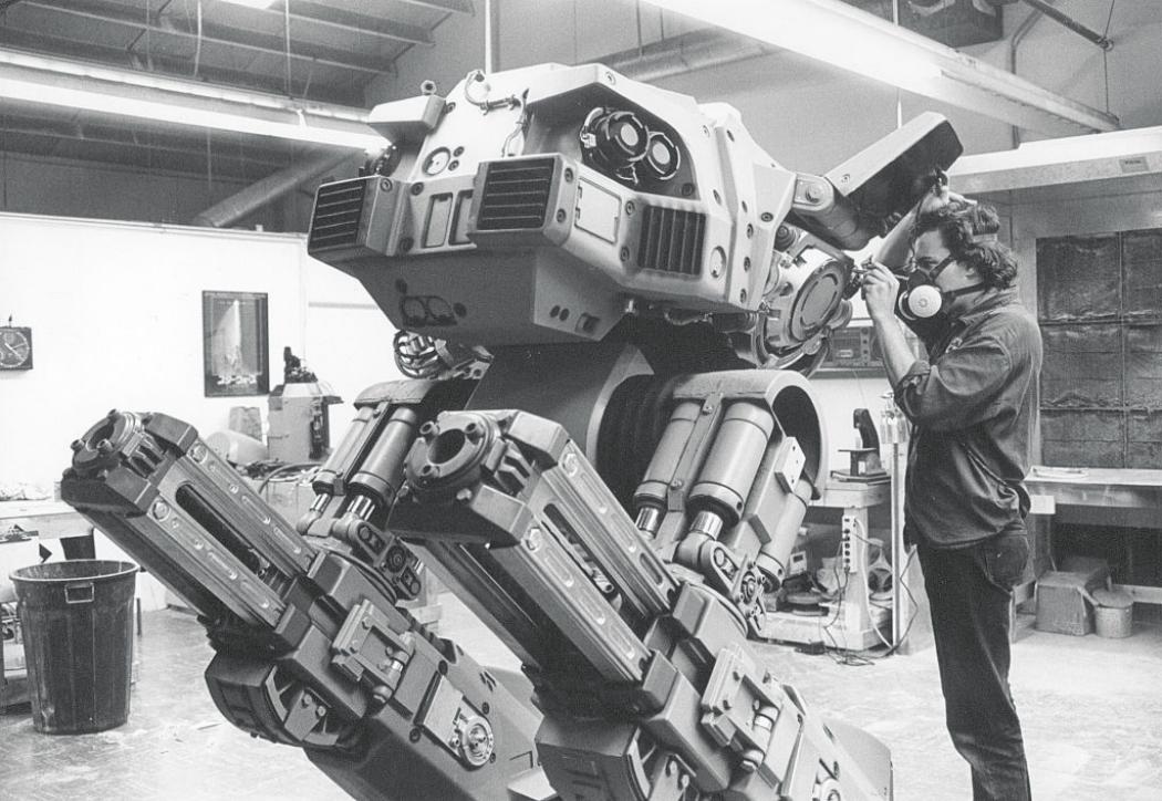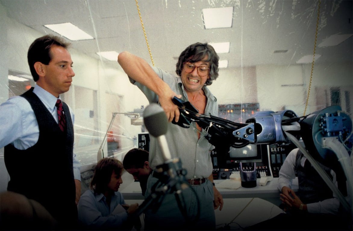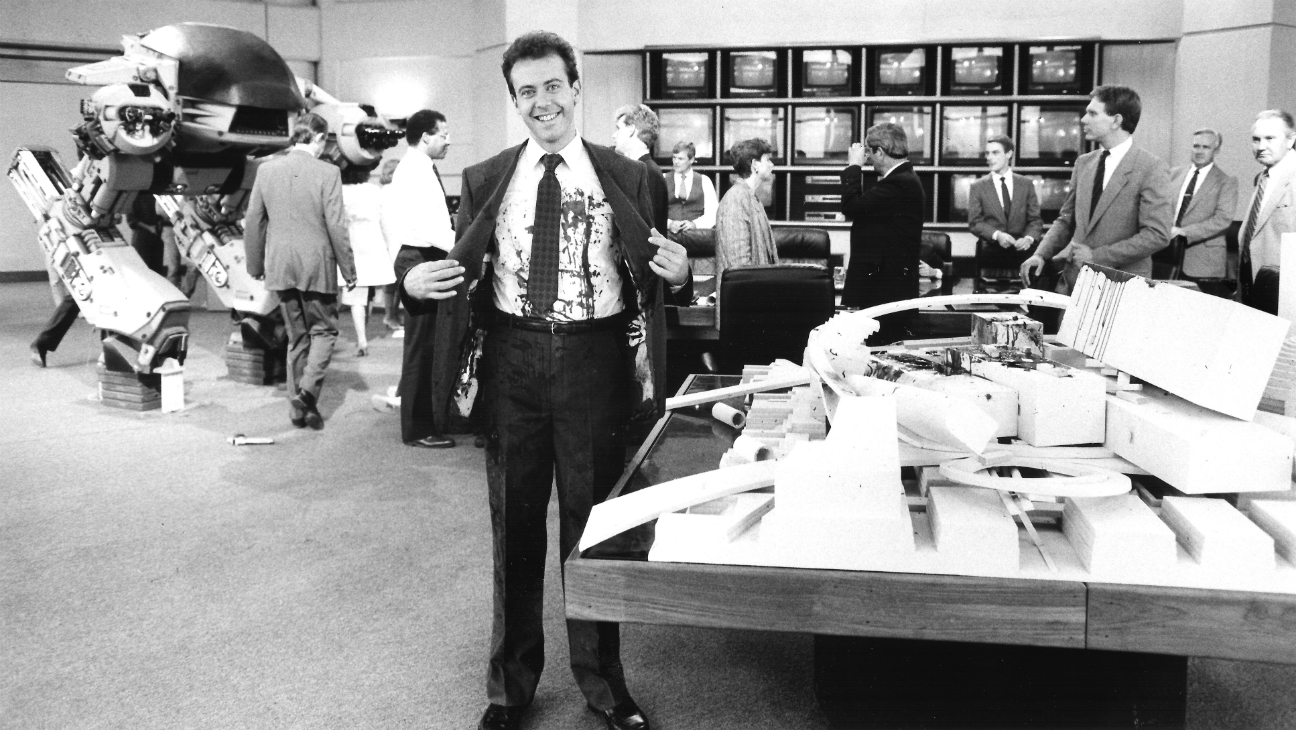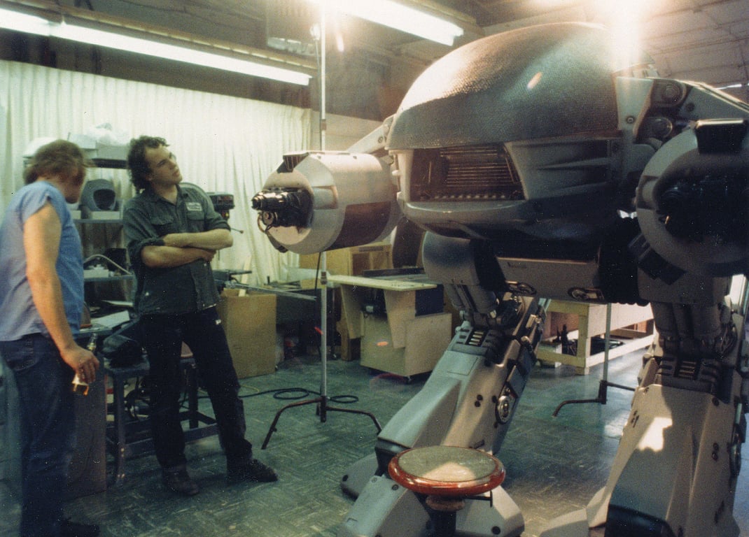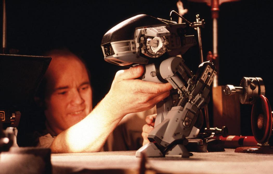 The suit and make-up (remember the melting Emil?) rightly get a lot of attention, but sometimes it feels Tippett’s work on Jones’s baby ED-209 gets overlooked in retrospectives—Tippet was after all BAFTA-nominated for his work here. The American Society of Cinematographers took a look back at the stop-motion creation in 2022. Together with ILM staff Harry Walton, Randy Dutra and Tom St. Amand, Tippett animated the puppet old-school style against a rear screen-projected background, saving on expensive and time-consuming compositing.