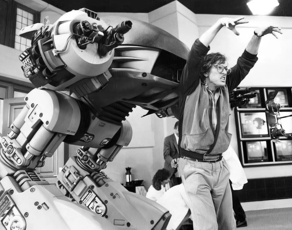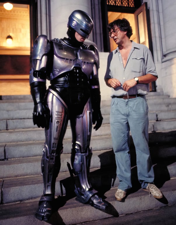 They started shooting at night, and I would go over at the end of my day, and I literally just started working on the movie just because you could do something—there were so many people, they didn’t know whether you were working or not. In doing so—because I just wanted to make movies and be on sets and stuff like that—I watched Ridley Scott direct four nights of Blade Runner, and it was astounding to be able to do. I made garbage for the street with the art department. One night they brought out that car, which they called a “Spinner”—it just had me at first sight, because I really like cars. At that moment, I was in a very refined location. I was in the atmosphere created by Ridley Scott, looking at a prop he had designed. After four nights—and maybe not enough sleep, because I was doing double shifts—I had this astounding idea: RoboCop came into my head as a title, and I saw the character in this kind of bluish armored thing. He was a policeman who was also a robot, and he was looking at this strange human race. It was an A.I. idea, like, “Why are people the way they are?” And that was the most science-fiction notion of it.