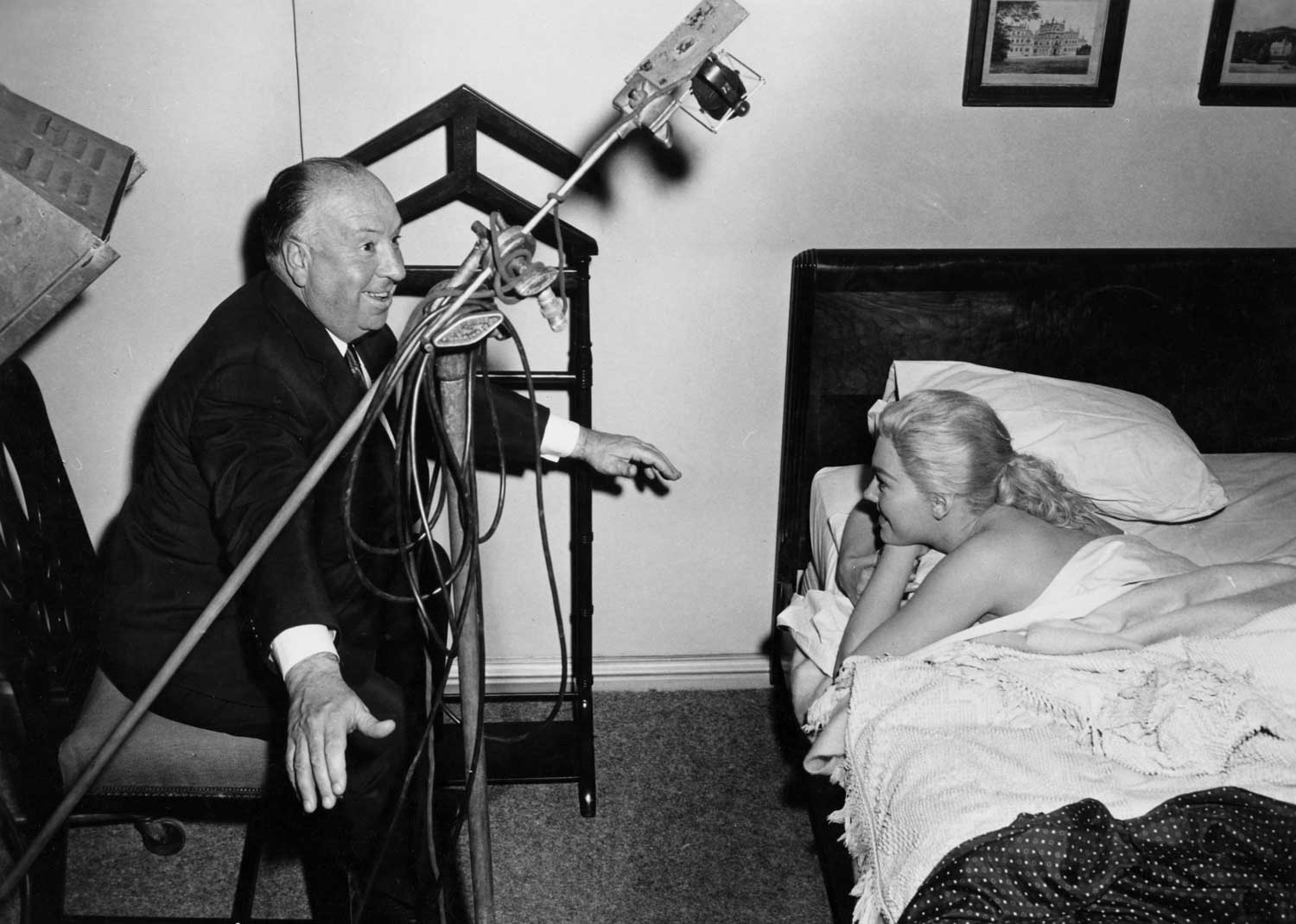 Hitchcock and Kim Novak share a light moment on the set while filming the aftermath of her dive into the water in Vertigo.